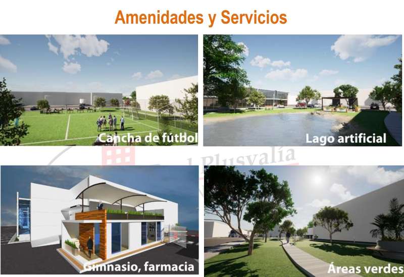 - Cancha de fútbol, Lago artificial, Gimnasio, Farmacia, Áreas verdes, Plaza comercial, Cafetería, Guardería y Área de descanso