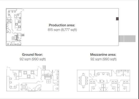 Building area: 11,800 sqm (127,014 sqft) Available area: 999 sqm (10,757 sqft) Office area: 92 sqm (990 sqft) Production area: 815 sqm (8,777 sqft) Mezzanine area: 92 sqm (990 sqft)