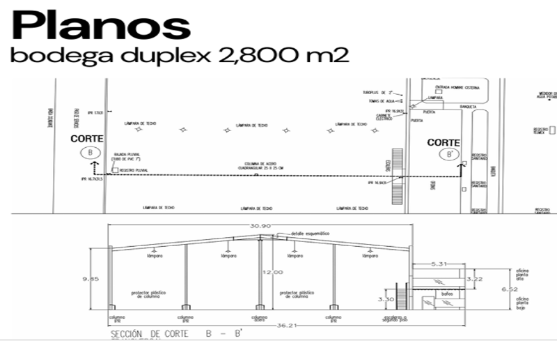 Superficie construída:2,800 m2: bodega 2,590m2, 209m2 de oficinas en 2 niveles, 2 modulos de baños H/M,